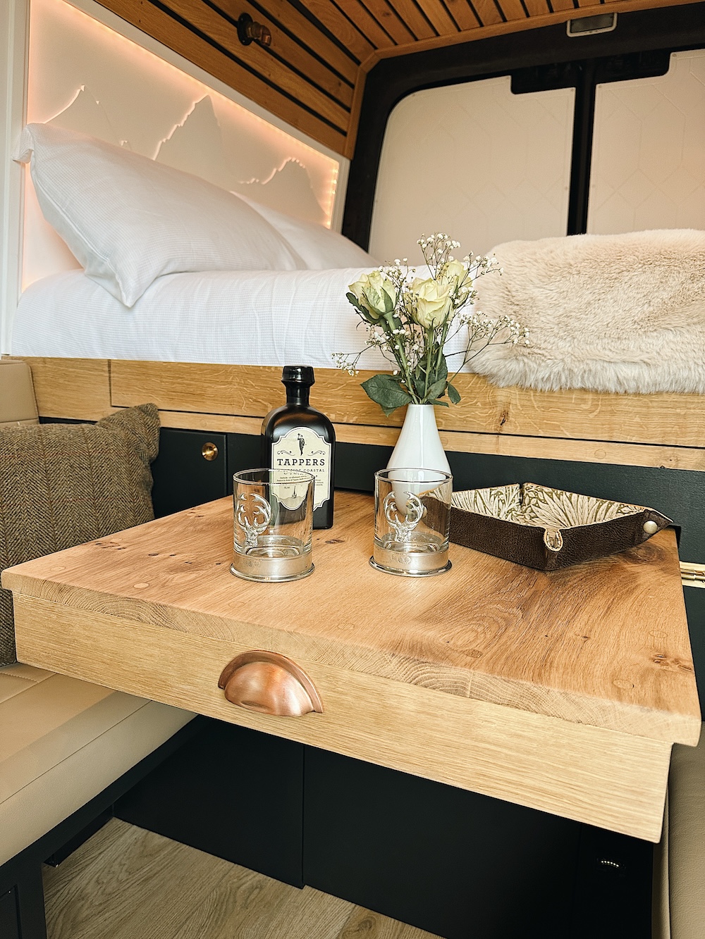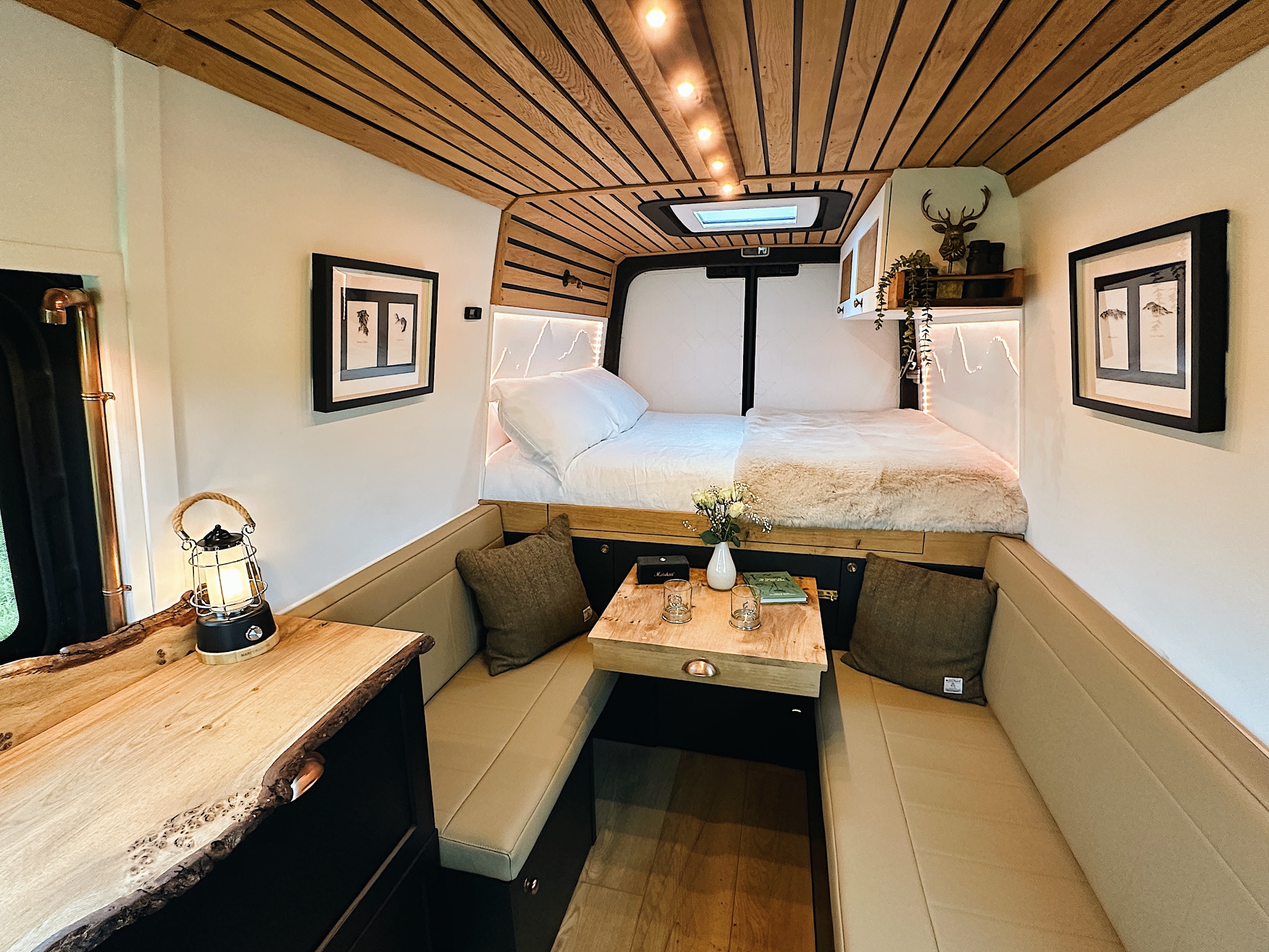 Full size kitchen and drawers with beautiful live edge Pippy Oak worktop and splashback. Sink with copper tap. Thetford hob, My Place Wonder Oven and copper lighting.