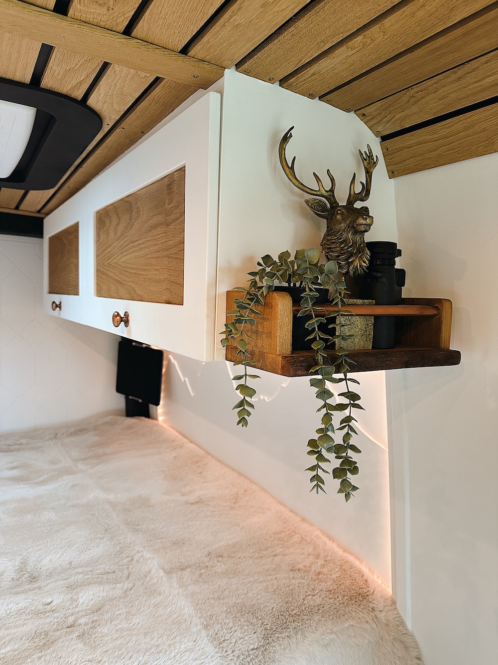 Large over cab storage, upper storage cabinets with oak doors, copper door handles, soft close hinges and heavy duty magnets. Large under sofa storage and additional storage cupboards under the bed. Plenty of space in the garage too.