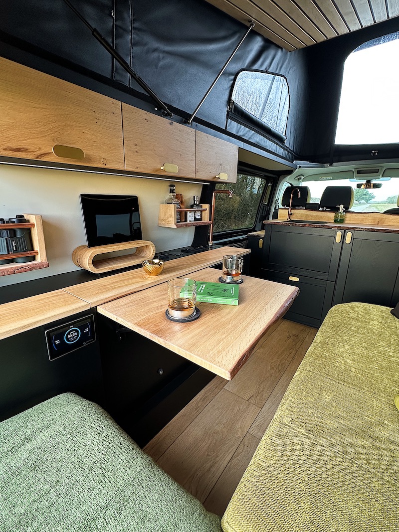 During the day you can relax on the inclined sofa, it’s 185cm long and sits across the rear of the camper too. Opposite we have oak fronted cabinets, an oak ipad and laptop stand, lower storage units with lift up lids. Her oak table flips up in place for drinks, dining, games and working at.